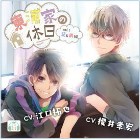 ● 商品名 ● 東浦家の休日vol.1~兄&弟編 ● キャスト ● 櫻井孝宏/江口拓也 ● 発売日 ● 2013年8月30日 ● 価格 ● ¥2,100(税込) ● シナリオ ● エッジワークス ● イラスト ● めろ